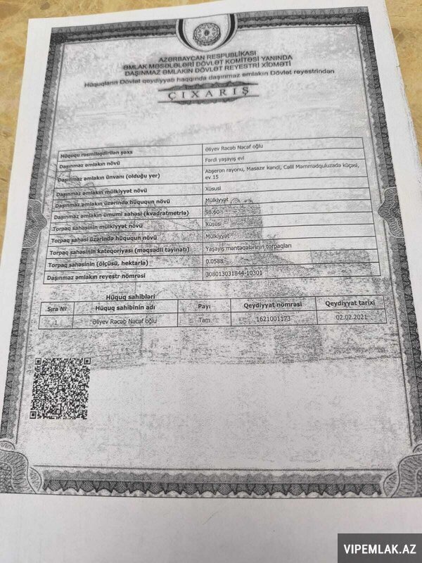 Maştağa qəsəbəsi, Tavaylıq deyilən ərazidə, əsas yoldan 50 metr məsafədə yerləşən, 2.5 sot torpaq sahəsinin üzərində inşa edilmiş ümumi tikili sahəsi 60 kv/metr olan, 3 otaqdan ibarət həyət evi satılır.