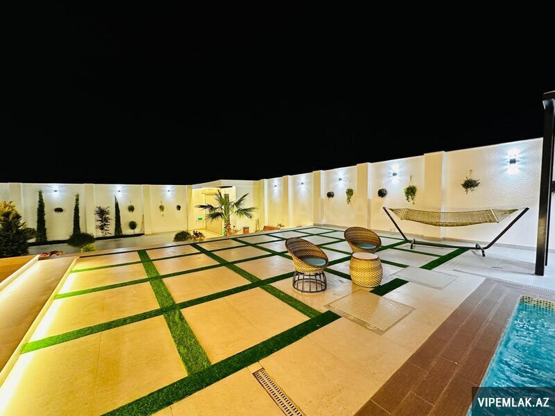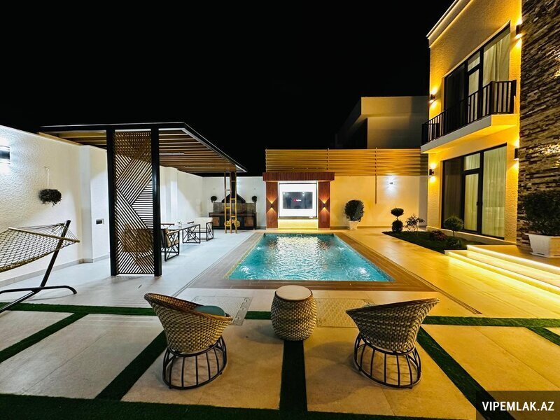 Həyətində filtirli hovuzu, istirahət zonası , şəlaləsi , yay-qış mətbəxi əlavə olaraq 2 maşınlıq qarajıda var