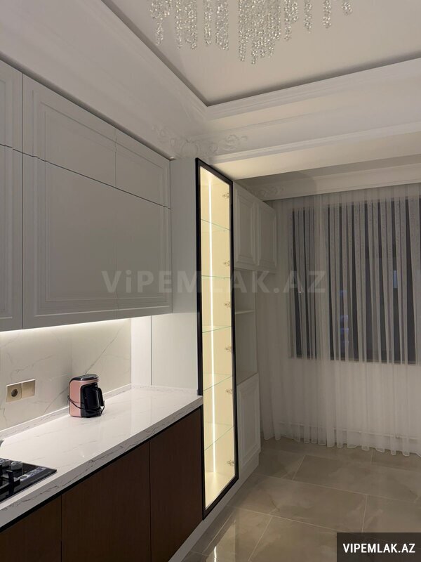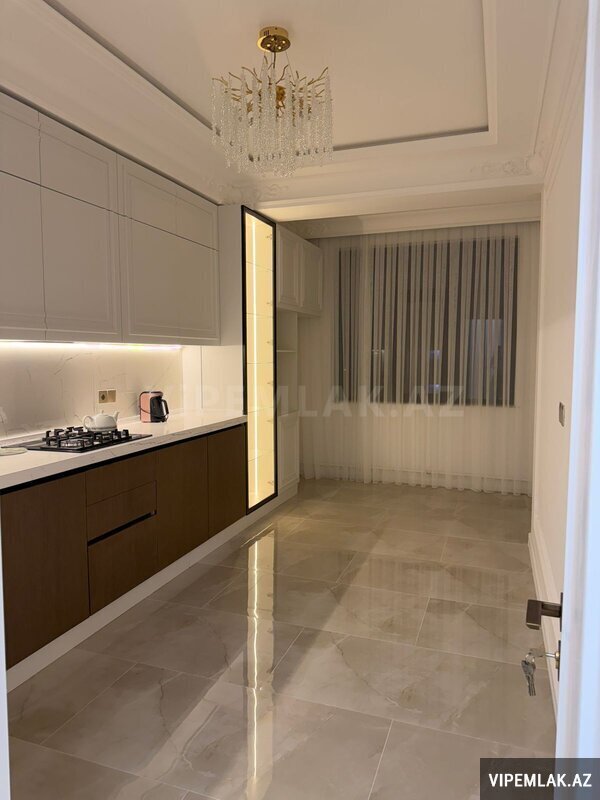 Mənzilin quraşdırılmış mətbəx mebeli, eyvanı, kombi sistemi, duş-kabinası və s var. Bütün mənzil isti polla təchiz olunub.