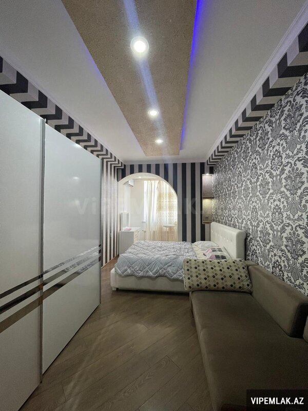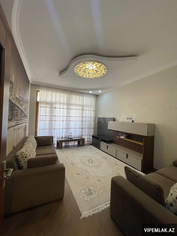 - Zövqlə tərtib edilmiş geniş zal: dekorativ asma tavan, LED işıqlanma, city-view divar paneli, TV stendi, yumşaq mebellər və xalça